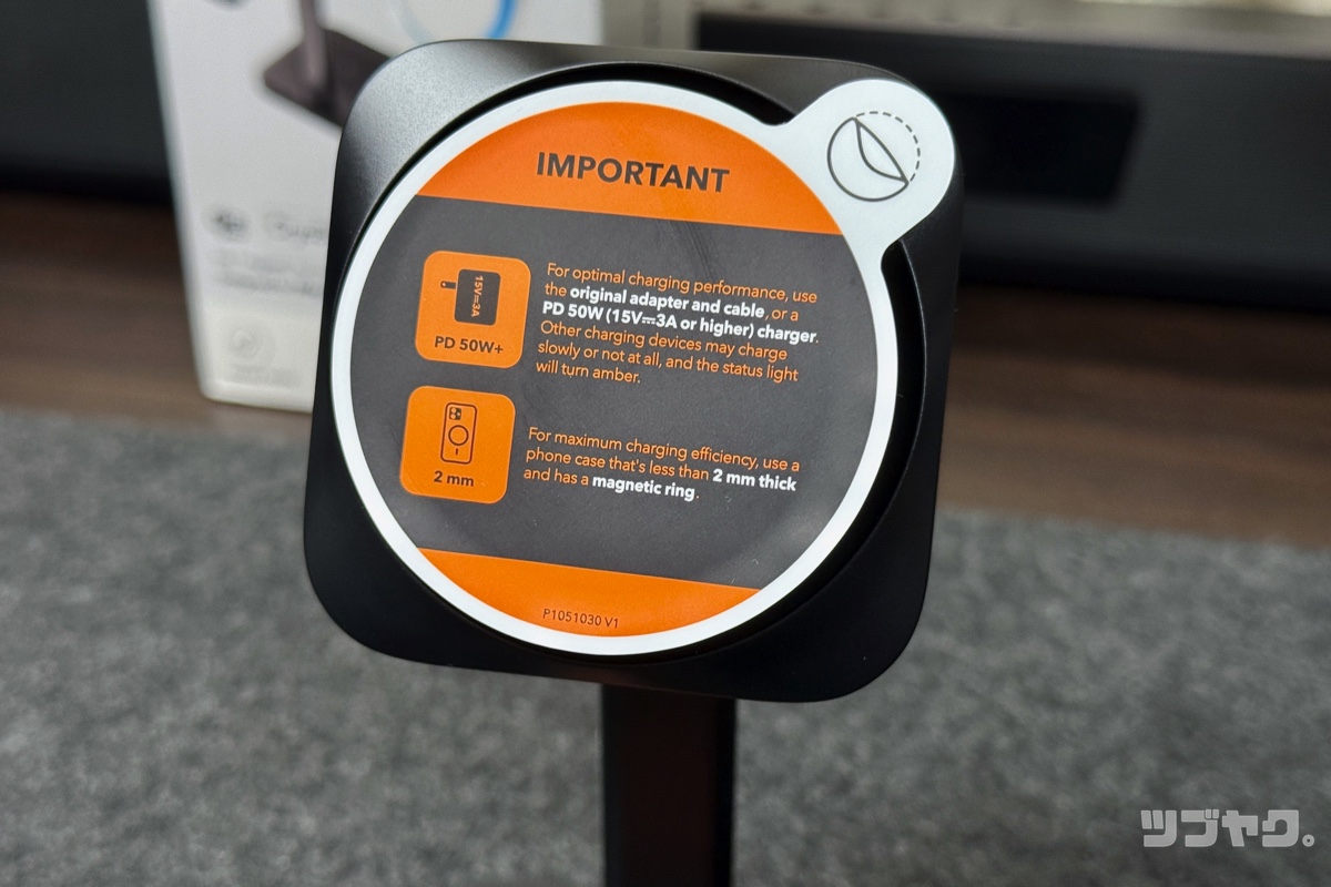 Qi2.2の高速充電に対応するため、付属のアダプターは50Wの高出力仕様。